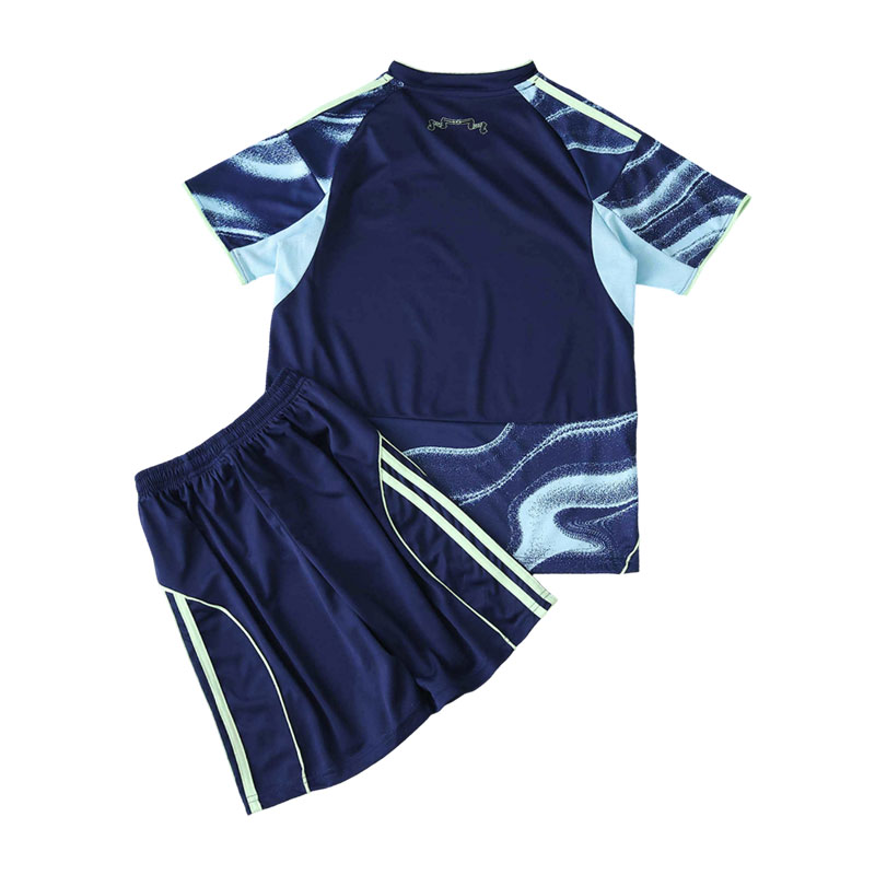 Ajax Amsterdam 2025/26 udebanesæt til børn – trøje og shorts – er en hyldest til Amsterdams unikke ånd og byens 750-års jubilæum. Det flotte mørkeblå design er inspireret af byens berømte kanaler og vandveje, med smukke bølgende mønstre i aqua nuancer, der giver trøjen et friskt og moderne udtryk.