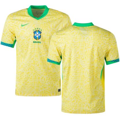 Brasilien fodboldtrøje er nu til salg. Denne Custom fodboldtrøje, kendt som ‘Hjemmebanetrøje’, er designet til sæsonen 2024/25. Det er en billig mulighed for fans at vise deres støtte. Trøjen har detaljer, der fejrer holdets deltagelse i ‘Copa America 2024’. Og det bedste af alt, det kommer med gratis forsendelse!